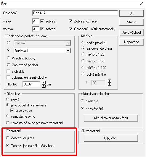 V dialogovém okně Řez, lze nyní vytvořit řez do nového okna. Vytvořený řez, bude automaticky neviditelný. V půdoryse bude však vidět čára řezu. Mezi půdorysem a řezem můžete přepínat v roletovém menu Okna.