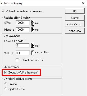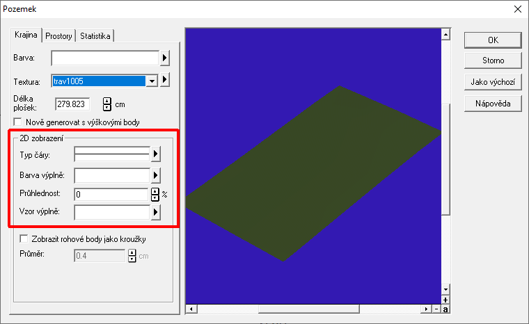 Dialogové okno vlastností terénu Pozemek bylo rozšířeno o možnosti 2D zobrazení. Nyní můžete použít stejné nastavení jako např. pro prostory. Toto dialogové okno se automaticky otevře po definici nového terénu. Nebo jej otevřete, pokud poklepete myší v půdoryse na již vytvořený terén.