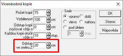 Funkce pro vícenásobné kopírování objektů byla rozšířena o odstup ve směru Z. Díky tomu je velmi snadné vytvořit např. kopie podesty jako schodiště. Tuto funkci lze použít pro podestu ale také pro 3D objekty.
