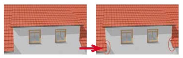 Boční přesah přerušení okapu u vikýře lze nastavit pro obě strany. Toto nastavení naleznete v dialogovém okně vikýře u volby S přerušením okapu. Zde naleznete volby Přesah vlevo a Přesah vpravo.